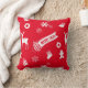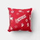 Un carré lance l'oreiller avec une répétition blanche sans couture des éléments de Noël - bas, brasserie, flocons de neige, rennes, ornements de Noël, bougies, sapin de Noël, et les mots "Joyeux Noël" - en illustration, contre un arrière - plan rouge. Décorations de Noël pour la maison !
