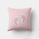 Coussin avec une adorable image d'empreintes de filles roses avec un gros contour blanc et des pois blancs sur un arrière - plan rose derrière l'illustration.