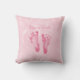 Un coussin de faire-part de naissance de bébé avec des empreintes de pas roses mignonnes sur un fond rose girly doux. Personnalisez en ajoutant le nom de votre bébé au texte personnalisable qui indique : Bébé.