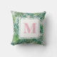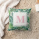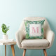Le design coussin de style tropical présente un motif en feuilles de palmier vert de frondes en couches avec un arrière - plan de style lin subtil. Le cadre décoratif blanc a une lettre monogramme en rose vif (peut être customisé) que vous pouvez personnaliser avec votre nom initial.