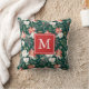 Nos oreillers à jetons floraux d'hiver présentent votre monogramme ou vos initiales à l'intérieur d'un cadre rouge, carré avec un motif de fleurs poinsettia aquarelle, fleurs d'ivoire, baies sèches et feuillage vert luxuriant contre un arrière - plan vert.