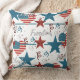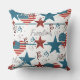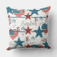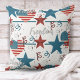 Le coussin est décoré d'étoiles patriotiques, de coeurs et de confettis aux couleurs du drapeau américain aux couleurs vintages et rétro. Les mots Liberté, Foi et Liberté sont éparpillés au hasard dans la conception.