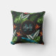 Un arrière - plan noir chic. Forêt tropicale verte et bleue, jungle. Palmier et feuilles de banane, feuillage aux fleurs rouges et oranges, fleurs. Un cadre noir et orange avec espace pour votre nom et lettre monogramme. Le nom est écrit avec un script de style moderne écrit à la main.