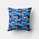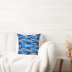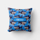 This personalized playful cartoon shark throw pillow features a friendly yet toothy Great White shark with a charismatic grin, set against a brilliant ocean-blue background with stylized white waves.