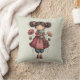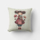 Pillow with a cute retro image featuring a whimsical girl with rosy cheeks and flowers in her hair. Carrying a green frog doll.