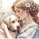 A gentle close-up of a young woman embracing a golden retriever, her expression radiating warmth and affection. The camera slowly zooms in, capturing the delicate details of her floral hair accessory and the soft fur of the dog. The background features a dreamy garden with pastel flowers, enhancing the serene atmosphere. Soft, diffused lighting bathes the scene in a warm glow, evoking a sense of nostalgia and tranquility. The composition is painterly, reminiscent of a classic illustration, inviting viewers into this tender moment.