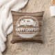 Un coussin de camping simple mais élégant avec la phrase "Happy Campers". Customisez avec votre nom de famille. Présenté avec un arrière - plan rustique en lattes de bois, parfait pour compléter votre décor rustique de camping-car.