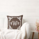 Le design élégant et moderne du coussin carré accent dispose d'un cadre géométrique clé grecque et monogramme qui peut être personnalisé. Couleurs brun espresso foncé et blanches. La couleur Arrière - plan peut être modifiée.