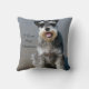 Adorable schnauzer miniature assis sur la plage de sable humide. Le texte dit "I Love Mini Schnauzers" devant et derrière le coussin.