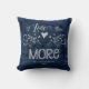 "Coussin jetable typographique en bois teinté bleu marine rustique 'Je t'aime plus' de style ferme." Il est possible d'inclure vos noms et une date (ou d'effacer le texte dans le modèle si vous le préférez non personnalisé). Fond en planche de grange en bois teinté bleu marine peint à la main avec une conception typographique esquissée comprenant des fleurs en forme de cœur, du feuillage et des volutes. Œuvre créée par l'artiste et designer sous licence internationale, Audrey Jeanne Roberts, copyright.