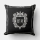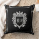 Coussin noir avec initiales de blason de couple. Ce coussin noir et blanc est élégant et sophistiqué.