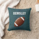 Un accent sportif lance l'oreiller avec des graphismes d'un maillot de sport turquoise à l'aspect arrière - plan, avec un football brun et blanc, sur le devant. Le texte blanc, sur le devant a le nom et le numéro du grand joueur, sur le dos. Personnalisez le texte pour vous-même ou pour votre fan ou joueur de football favori.