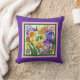 Joli coussin fleuri, iris peint encadré de rose/vert, sur un coussin violet foncé.