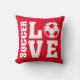 Red SOCCER LOVE Soccer joueurs coussin. Les joueurs de football vont adorer ce coussin de football confortable! Ce coussin de Football a un thème d'Amour avec les mots SOCCER et LOVE en caractères blancs gras. Un ballon de football sert à la lettre O donnant à ce design un véritable thème de football. Sur le dos de ce coussin est le même Soccer Love design mais imprimé comme un fantastique tout sur papier à motifs. Ce coussin confortable est très bien placé sur n'importe quelle chaise et montrera à tous ceux que vous avez un amour ardent pour le football. Plus de cadeaux et de marchandises amusants sur le thème du football disponibles dans le magasin STAND UP AND CHEER!