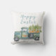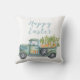 Joyeux Camion Vintage de Pâques jetez l'oreiller ! Comprend un camion vintage bleu vert avec des carottes et des fleurs blanches à l'arrière. Sur la porte latérale se trouve un chapelet de carottes et un décor de lapin. "Bonne Pâques" est dans une jolie typographie bleue.