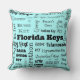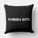 Un coussin avec du charme comportant le nom des clés de la Floride et certains de ses emplacements populaires en texte noir des polices variables et des tailles sur un fond clair de bleu d'aqua. Le dos est noir solide avec les mots la "Floride verrouille" dans le blanc. Renversez juste le coussin pour changer rapidement le regard de votre pièce.