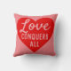 Coussin rouge avec une grande image de coeur. Un message optimiste sur un coussin qui dit "L'amour conquiert tout". Le thème rouge et rose avec un grand coeur comme motif principal. Coussin rose.