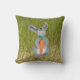 Le lapin tenant une carotte orange se tient dans un champ d'herbe verte. L'herbe Arrière - plan est reproduite à l'arrière du coussin.