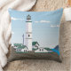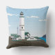 Ce dessin présente un phare blanc, vert et noir qui surplombe la mer. Le ciel est bleu avec quelques nuages. Des maisons blanches aux toits verts entourent le phare. L'arrière du coussin est le même que l'avant. Ce design est disponible sur différents styles et tailles.