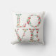 Ce coussin d'AMOUR sucré présente des lettres florales décoratives qui expliquent l'AMOUR. Chaque lettre a une vigne verte avec des fleurs rouge vif. Certaines lettres contiennent une enveloppe et une couronne rouge. Les couleurs sont vert, rouge et blanc cassé. Le dos est une couleur rouge coordonnée.