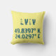 Design d'oreiller de lancer moderne caractéristiques de latitude et de longitude coordonnées pour Lviv, Ukraine en caractères bleu foncé en détresse sur l'arrière - plan jaune