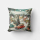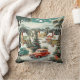 Coussin de style moderne mignon du milieu du siècle montrant de belles maisons, voisins, arbres de Noël décorés, rues enneigées avec des voitures rouges et turquoise. De belles montagnes enneigées dans l'arrière - plan. #générativecontent