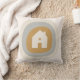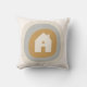 This minimalist house illustration throw pillow features a simple, clean silhouette of a house with a small heart at its center, nestled within soft, organic concentric circles with mustard gold, soft grey, and creamy beige.