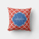 Un motif marocain à la mode orange-rouge quatrefoil carré jetez oreiller avec un badge bleu que vous pouvez personnaliser en ajoutant votre nom et monogramme initial à. Il fait partie de la collection Cherry Tomato and Palace Blue Spring Quatrefoil Collection