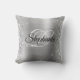 Créez votre propre oreiller monogramme soyeux gris argenté pour elle. Des graphiques de parties scintillant de tons argent brillant et décoratifs bordent les bords latéraux à l'avant et à l'arrière. L'arrière - plan présente un art numérique métallique gris argenté à l'ombre sombre en graphique. Les scintillants de luxe, la parties scintillant et la feuille seront créés avec des éléments artistiques qui s'impriment comme une photo.