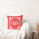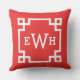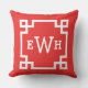 Le design élégant et moderne du coussin carré accent dispose d'un cadre géométrique clé grecque et monogramme qui peut être personnalisé. Corail orange rouge et blanc. La couleur Arrière - plan peut être modifiée.