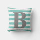 CLIQUEZ SUR PERSONNALISER L'OPTION MODÈLE ET ENTREZ MONOGRAM LETTERCarrière - plan turquoise de lumière personnalisable avec bandes blanches des deux côtés du coussin. Gros monogramme initial en gris centré sur le devant.