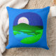 Jetez l'oreiller dans une illustration circulaire d'une pleine lune qui s'élève au-dessus de collines vertes au bord d'un lac, avec un ciel étoilé bleu nuit