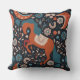 Un cheval rouge brun avec crinière bleue et queue s'élève sur cet oreiller distinctif. L'image du cheval est entourée de fleurs de style boho, de feuilles, de symboles et de lunes de croissant. Les couleurs dominantes sont le marron cannelle, le bleu ardoise, le bronze et le bleu marine. Les deux camps ont la même image.