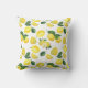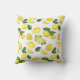 Coussin avec un mignon motif de citrons jaunes avec des feuilles verts et des tranches de citron fraîchement coupées.