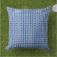 Les carrés "fils" bleu foncé sont carrelés pour donner un motif lâche devant et derrière le coussin.