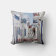 Lancer l'oreiller de 16" x 16" avec l'image d'une aquarelle représentant une ruelle pavée pittoresque sur l'île de Mykonos, une île grecque faisant partie des Cyclades, située entre Tinos, Syros, Paros et Naxos. Bleu derrière.