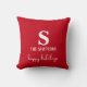 Personnalisez ce coussin tendance et élégant avec votre nom, monogramme et salut personnel. Design propose des informations personnalisées sur le devant d'un arrière - plan rouge classique avec des rayures de Noël à l'arrière du coussin pour ajouter une touche festive amusante de vacances. Ce coussin ajoute une élégante ambiance festive à votre décor de vacances. Facile à customiser tout le texte. Joyeuses fêtes !