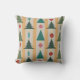 Cet oreiller de lancer a un design moderne du milieu du siècle des arbres de Noël et des ornements enfilés sur une guirlande avec un arrière - plan or et argent.