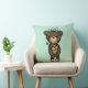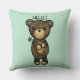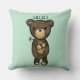 Un coussin avec une simple illustration d'un ours brun caricaturé tenant une marguerite jaune. Bonjour écrit au-dessus de sa tête.