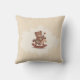 Un coussin avec l'illustration d'un jouet en bois : un ours en peluche souriant à cheval à bascule dans les tons chauds contre un arrière - plan doux et taché. L'ours porte un petit tablier d'artisan et tient un petit outil en bois. Une bonne idée cadeau pour une famille ou un enfant !