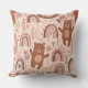 Un oreiller décoratif avec un motif de nurserie bohème élégant et doux représentant des ours en peluche marrons adorables dans des poses ludiques, associés à des arcs-en-ciel boho chaleureux ornés de cœurs et de détails pointillés. Conçu dans un style scandinave moderne, l'illustration utilise des tons chauds et feutrés de marron, taupe, beige et rose blush sur un fond neutre clair, créant une esthétique neutre et apaisante