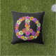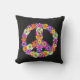 Un panneau de tranquillité fleuri dans les tons rose, jaune, orange, violet, vert, blanc et noir constitue la pièce maîtresse de cet oreiller boho chic.