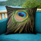 Élégant oreiller noir jeté avec un gros plan coloré en plumes de paon.