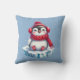 Un mignon pingouin aquarelle assis sur un iceberg portant un foulard rouge, un casquette et des oreilles avec des flocons de neige.