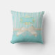 Un carré vintage de style victorien lance l'oreiller avec des rayures bleu aqua, agrémenté d'une image de ruban couleur crème attaché dans un arc fixé à une chaîne de perles élégantes. Personnalisez ce design girly en ajoutant votre nom au cadre doré orné. REMARQUE : Il s'agit d'une image imprimée à plat. L'arc, la dentelle, les perles et le cadre doré ne sont PAS réels.