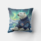 A polar bear, wearing a colorful sweater, sits on an ice floe as the aurora borealis illuminates the sky, creating a magical backdrop
