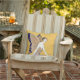 This decorative pillow in outdoor fabric has a pretty fairy with curly blond hair in a long strapless gown with monarch butterfly wings on a bright golden yellow background.