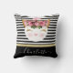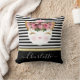 coussin monogramme de princesse rose en or kitty. Joli visage de princesse chatte en or rose, parties scintillant rose et or rousse, nez en forme de coeur rose et de grandes cils dorés parties scintillant oeil, avec une couronne et rose et roses rouges arrangement floral. Lignes noires et blanches rayées arrière - plan avec ruban doré. customisez facilement et ajoutez votre nom pour personnaliser le coussin.