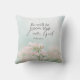 Jetez un oreiller avec une citation inspirante Écriture représente un simple jardin botanique avec de jolies fleurs roses et un arrière - plan bleu doux. Il présente la Bible Verse Psaume 46:10, "Soyez calme et sachez que je suis Dieu."