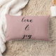 Une typographie assez élégante de coussin rose broussailleux avec l'adage amour et joie.